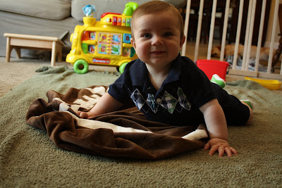 Another month has flown by! The big news this month has been the arrival of Brady's two front teeth. In related news, he also started eating solid food (July 19th, for my own reference). By the truckload. So far Brady is a great eater and gobbles up anything he is offered. When he's not eating us out of house and home, Brady enjoys playing peekaboo and loves being chased around the family room, especially by his daddy.